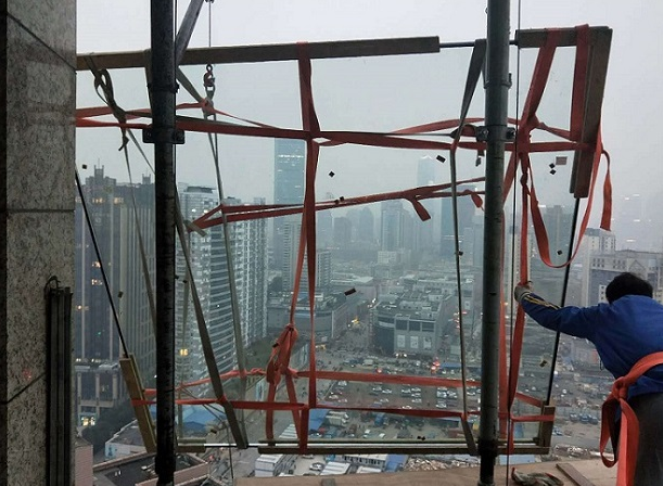 在進(jìn)行吊裝作業(yè)前,施工人員想將所要吊裝的建筑材料用吊裝帶捆綁固定好,有棱角的地方用保護(hù)套套住,以防劃破吊裝帶。樓上把吊具放下鉤掛住吊裝帶,樓下兩名工人用力往大樓的反方向拉動牽引繩,讓所吊物品和樓面保持一定距離,避免撞上墻面或者玻璃墻。